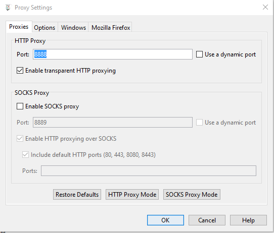 We enable HTTP proxy by clicking Proxy -> Proxy settings... and ticking Enable transparent HTTP proxying: