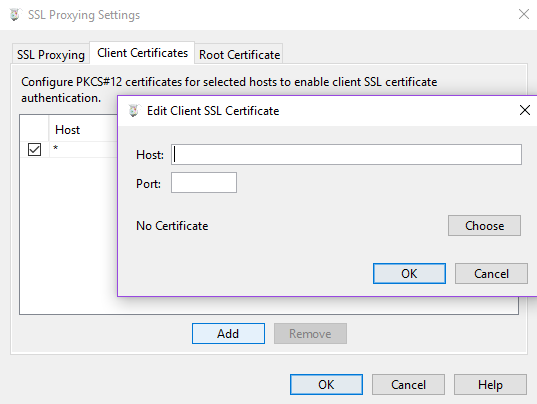 We also head out to the Client Certificate tab and Add a new empty Host and Port entry: