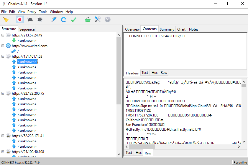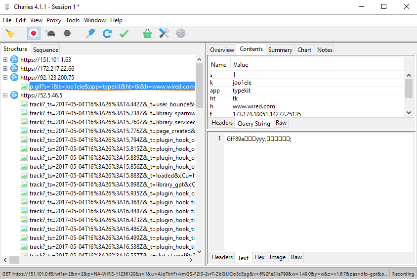 Now let's try an HTTPS site: Wired.com. Notice that other than the root / request, all other requests are encrypted: