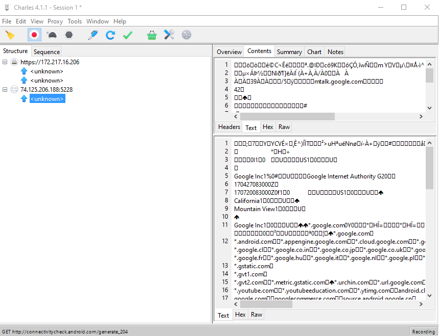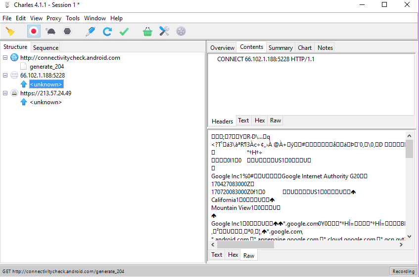 There are great tutorials out there on the subject of analyzing and manipulating traffic using Charles Proxy (link, link, link), so we won't dive into the subject in this one. Also - the main screen is very easy to understand as it is. You can see that my emulator did some requests to http://connectivitycheck.android.com/generate_204, and also some HTTPS requests which we can not decipher for now.