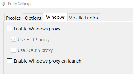 Since we're only interested in capturing the emulator's traffic and not the host computer's, let's turn off implicit traffic capturing, and only capture traffic that goes through the proxy explicitly. On the Windows tab we uncheck all of the boxes: